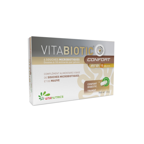 La formule de VITABIOTIC CONFORT ATB 15 gélules est enrichie en souches microbiotiques et en Mauve permet de réguler le microbiote et d’améliorer rapidement le confort digestif.