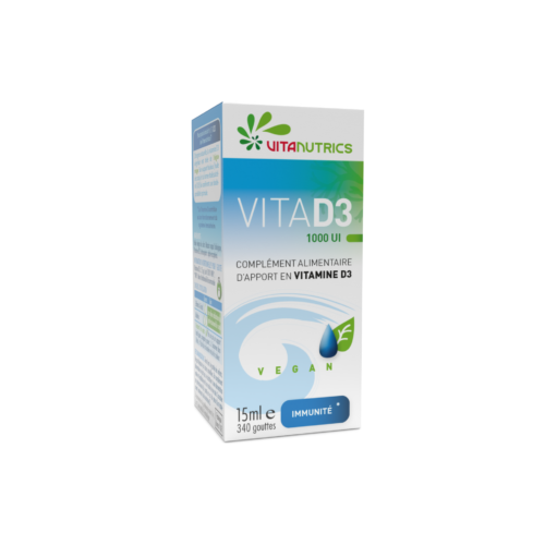 - Une vitamine D3 végan et naturelle hautement concentrée (1000 UI / goutte)